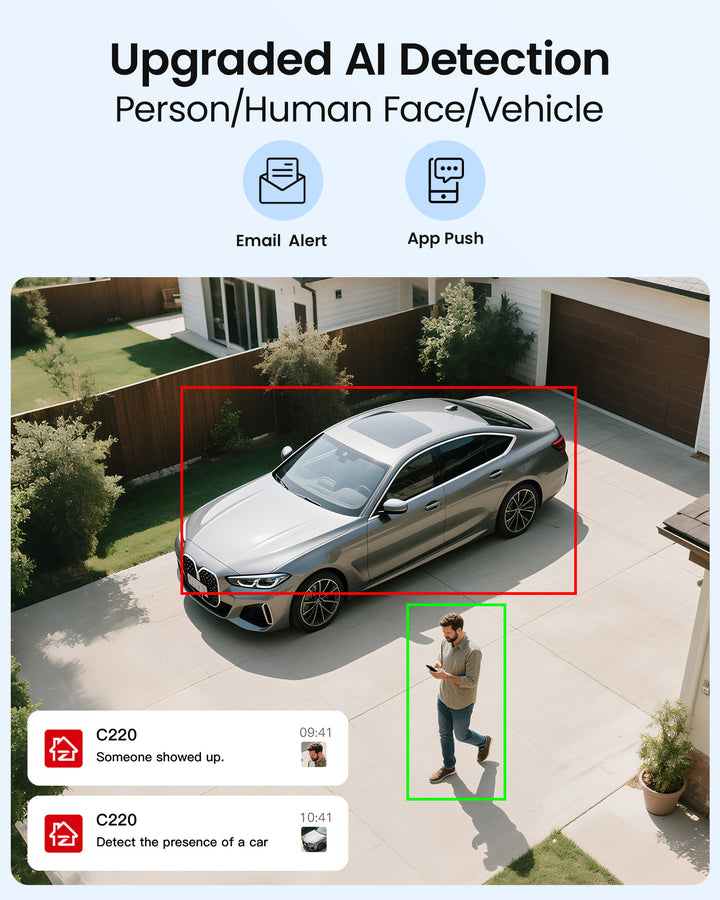 • Person/Vehicle Detection: Minimize false alerts with the latest person and vehicle detection feature, customizable to your preferences.