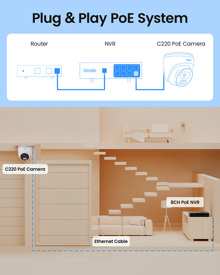 • PoE Plug & Play Simply plug the camera into the NVR using a PoE connection, eliminating the need for separate power cables. This beginner-friendly setup is perfect for DIY enthusiasts.